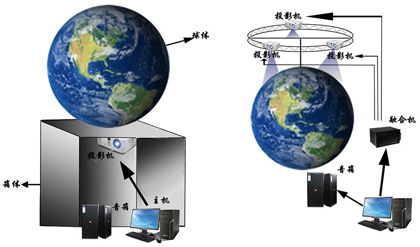 球幕投影系統(tǒng)是一種新興的展示技術(shù),它打破了以往投影圖像只能是平面規(guī)則圖形的局限。系統(tǒng)通過(guò)投影與邊緣融合技術(shù)相結(jié)合,能夠在一個(gè)球體表面上顯示出連續(xù)無(wú)縫隙全方位的影像,使整個(gè)產(chǎn)品體現(xiàn)出極其科技感、立體感、震撼的視覺(jué)效果,并能保證畫(huà)面不變形,畫(huà)質(zhì)清晰,色彩艷麗。球幕投影主要分為內(nèi)投球和外投球。